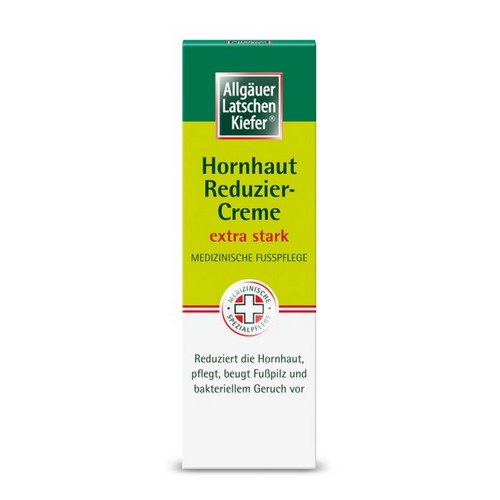 Die Allgäuer Latschenkiefer Hornhaut Reduziercreme extra stark mit der innovativen Anti-Hornhaut-Formel wurde speziell für beanspruchte und verhornte Füße entwickelt. Die wertvolle Wirkstoffkombination mit Fruchtsäuren, Weidenrindenextrakt und Original Allgäuer Latschenkieferöl reduziert die Hornhaut innerhalb weniger Tage. Pflegende Inhaltsstoffe wie Shea Butter und Panthenol sorgen für spürbar glattere und zartere haut. Fußpilz und bakteriellem Geruch wird vorgebeugt.