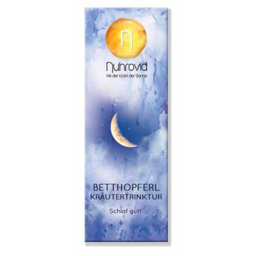 Betthopferl Kräutertrinktur beruhigt, entspannt und stärkt das Vertrauen, gut aufgehoben zu sein. Hopfen, Melisse, Lavendel und Himmelschlüssel entführen Sie sanft ins Reich der Träume. Sie bringen zur Ruhe, stärken die Nerven, unterstützen die Verdauung und fördern ganz allgemein einen guten Schlaf! Naturessenzen von Nuhrovia sind reine Naturprodukte, vegan, ohne Zusatzstoffe und daher besonders gut verträglich. Sie werden in Handarbeit aus Wildpflanzen hergestellt und über mehrere Wochen im Süden mit Sonnenlicht angereichert, daher ihr Name „Sonnenhellmittel“.