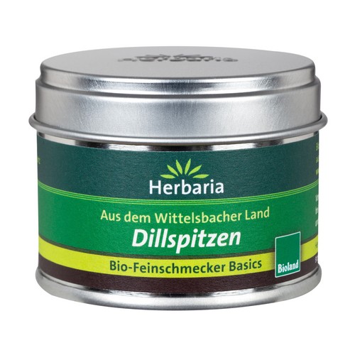 Herbaria Dillspitzen in Bioland-Qualität, angebaut auf gutem Lösboden eines traditionsreichen Familienbetrieb im Wittelsbacher Land bei Aichach-Friedberg. Dort wird gleich nach der Ernte direkt am Hof schonend getrocknet und im Anschluss bei Herbaria weiterverarbeitet. Vor dem Verzehr zwischen den Fingern reiben, ins Gericht geben und nochmals kurz aufkochen.