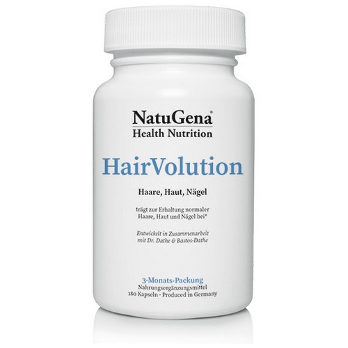 HairVolution ist eine fein abgestimmte Nährstoffformel mit natürlichen Vitalstoffen wie Bockshornklee, Aprikosenkern, Acker-Schachtelhalm, Acai-Beeren und vielen bioaktiven Vitaminen und Mineralstoffen für kräftiges Haar und eine straffe Haut.
