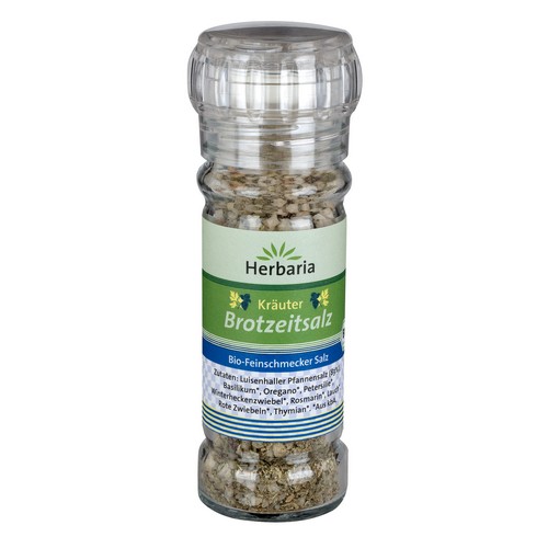 Herbaria Kräuter Brotzeitsalz ist ein Bio-Gewürzsalz für die Brotzeit in der Mühle. Mit Luisenhaller Pfannensalz und vielen Kräutern darunter Basilikum, Petersilie, Oregano, Rosmarin und Winterheckenzwiebeln passt diese kräuterige Mischung perfekt Gemüse und Salat, aber auch in Suppen und Soßen. Mit der praktischen Mini-Mühle kann alles direkt und zu jederzeit einfach gewürzt werden.