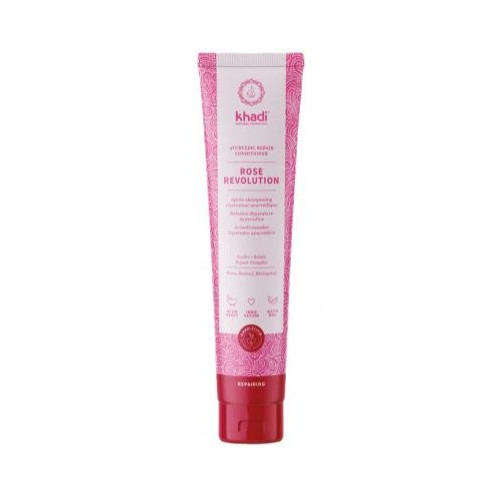 Der khadi Rose Revolution Ayurvedischer Repair Conditioner sorgt für sofortige Kämmbarkeit und tägliche Pflege ohne Silikone. Die ayurvedische Nährkraft des khadi Rose Repair Elixiers aus Rosenblättern und indischen Heilkräutern, wie Amla, Brahmi, Bhringaraj, baut den Haarschaft von innen heraus auf, regeneriert nachhaltig und sorgt für Fülle, Geschmeidigkeit und Glanz.