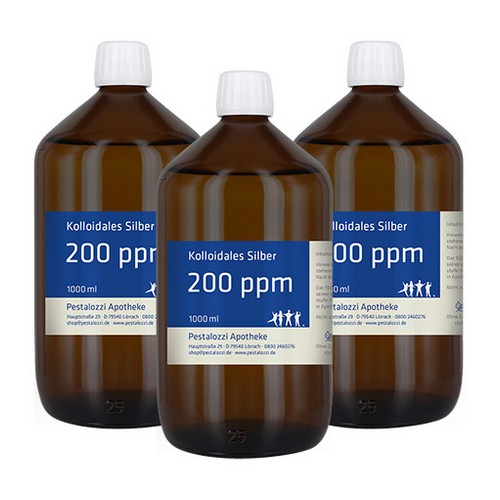 3 x 1000 ml "Kolloidales Silber - Pestalozzi Apotheke" in lichthemmender Apothekerbraunglasflasche