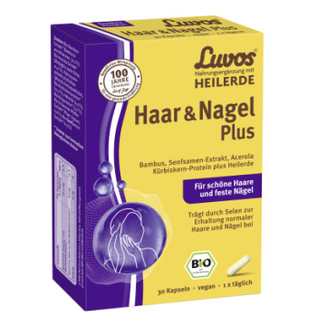 Luvos Haar & Nagel Plus ist ein optimal abgestimmter Bio-Komplex mit Heilerde und bio-zertifizierten pflanzlichen Zutaten. In dem hochwertigen Naturprodukt ist Heilerde mit bewährten pflanzlichen Naturstoffen kombiniert: mit siliziumreichem Bio-Bambus, Bio-Senfsamen-Extrakt, Bio-Kürbiskern-Protein und dem Bio-Enhancer Piperin aus Schwarzem Pfeffer. Enthält zudem Vitamin C aus der Acerola-Kirsche. Selen, aus dem Senfsamen-Extrakt, trägt zur Erhaltung normaler Haare und Nägel bei.