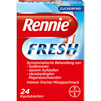 Lindern Sie Ihr Sodbrennen zukünftig mit Rennie® Fresh. Einfach jetzt Rennie® Fresh rezeptfrei bestellen. Erhältlich in Packungen zu 24 und 48 Kautabletten.