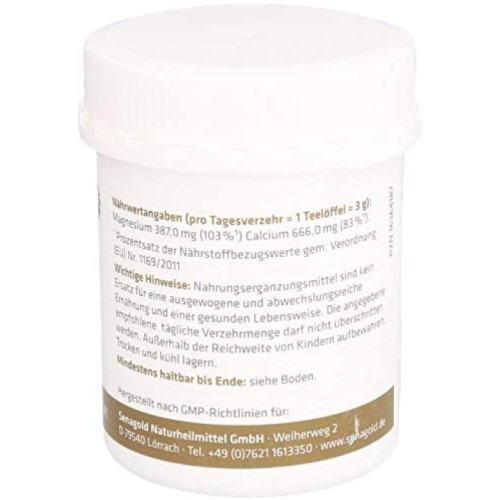 senagold Basenpulver enthält eine Calcium-/Magnesium Verbindung natürlichen Ursprungs mit der Mehrfachwirkung. Das Ca/Mg-Verhältnis von 2:1 sorgt zudem für eine optimale Aufnahme und Verwertung.