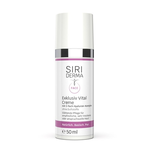 Siriderma Hautcreme Exclusiv-Vital ist eine hautglättende Pflege für die besonders anspruchsvolle, reifere und zur Faltenbildung neigende Haut. Die basische Hautcreme mit hochwertigen Ölen, Hyaluron und pflanzlichen Glyzerin ist auch bei sehr sensibler, allergiebereiter Haut geeignet.