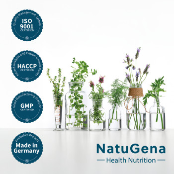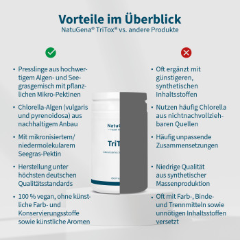 NatuGena TriTox®enthält eine ausgewogene Mischung aus zwei Chlorella-Arten (Chlorella pyrenoidosa und Chlorella vulgaris) sowie mikronisiertem Seegras-Pektin. Die Tagesdosis liefert insgesamt 3.036 mg Chlorella-Pulver, gleichmäßig verteilt auf beide Algenarten, und 3.038 mg Seegras-Pektin.