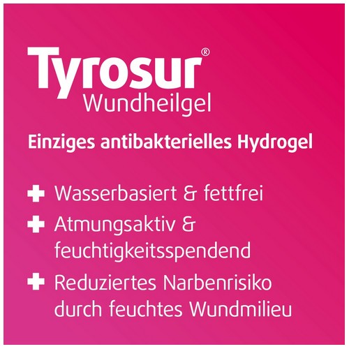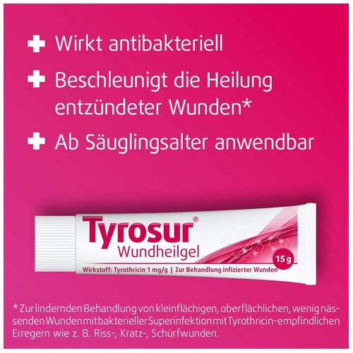 * Tyrosur® Wundheilgel/Wundheilpuder ist ein Wundbehandlungsmittel. Zur lindernden Behandlung von kleinflächigen, oberflächlichen, wenig nässenden Wunden mit bakterieller Superinfektion mit Tyrothricin-empfindlichen Erregern wie z. B. Riss-, Kratz-, Schürfwunden.