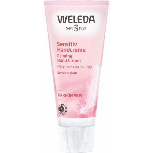 Die parfümfreie Sensitiv Handcreme von Weleda entspannt und erleichtert empfindliche und zu Irritationen neigende Haut und pflegt mit intensiver Feuchtigkeit.